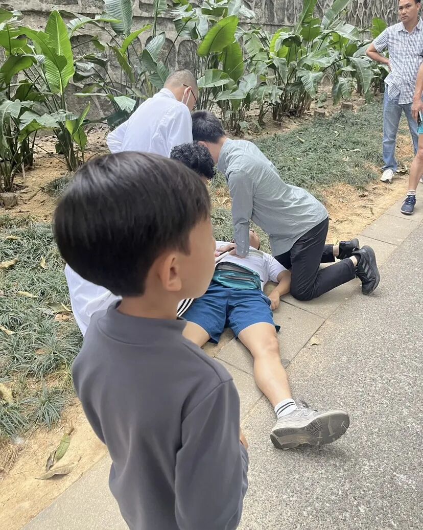 当天傍晚,蔡少鹏开车回家途中,经过祈福新村附近时,听见人群里传来急促的呼救声。他立即停下车跑过去,看到两名医护人员正跪在地上抢救一名昏迷男子,当即亮明身份加入救援。